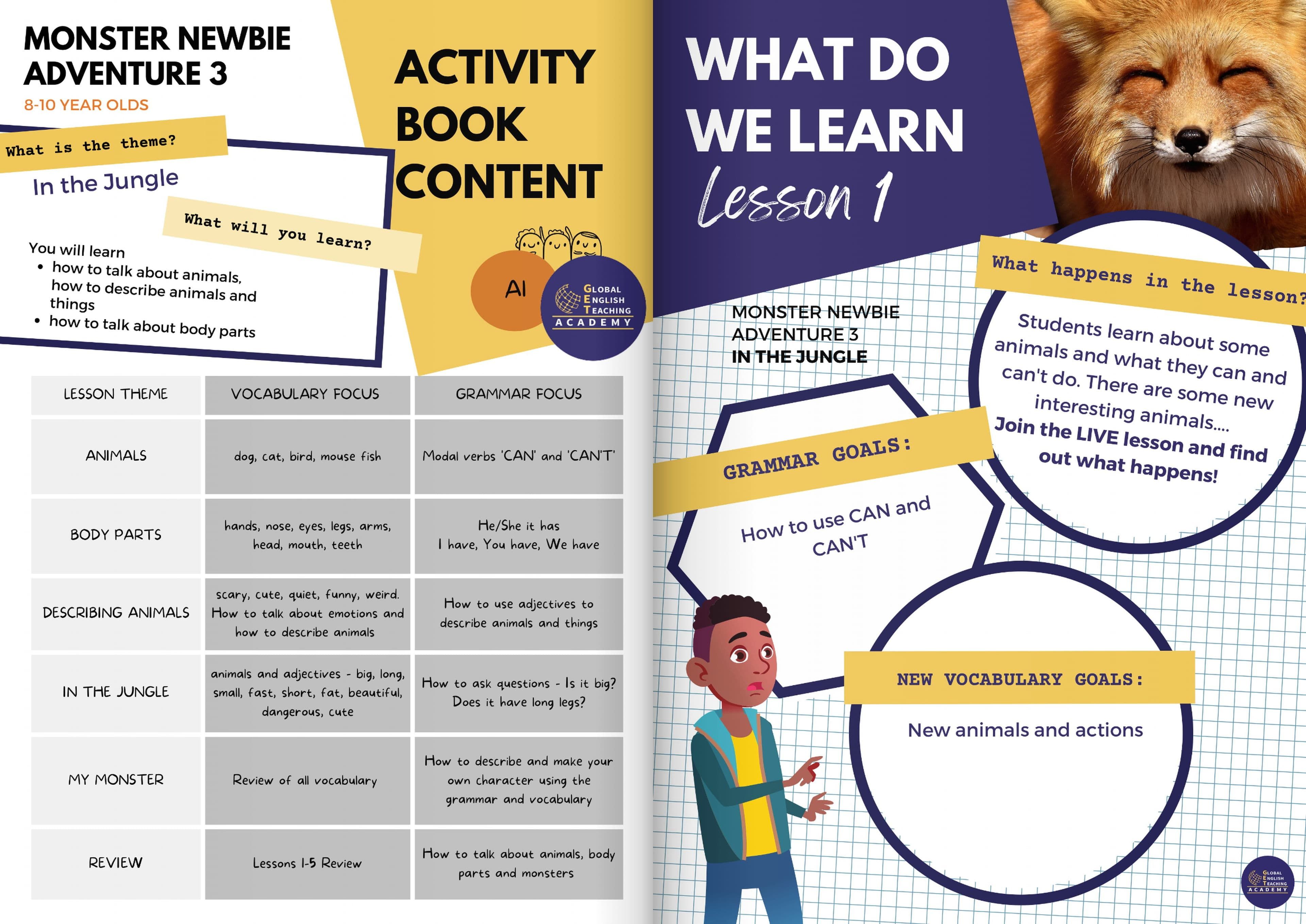 Unser Workbook wurde speziell entwickelt, um Ihrem Kind einen einfachen und unterhaltsamen Einstieg in die englische Sprache zu ermöglichen. Das Workbook “🦜 In the Jungle” umfasst insgesamt 47 Seiten. Es bietet eine vielfältige Sammlung von Rätseln, Übungen, Videos und vielem mehr und konzentriert sich unter anderem auf Themen wie 🐒 Tiere im Dschungel, 🦶 Körperteile und die dazugehörigen Vokabeln.